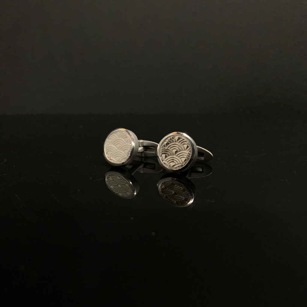 今回ご紹介するのはフルオーダーで作成したオリジナルのカフスボタン。トップには、日本の伝統文様「青海波(せいがいは)」が彫り込まれています。